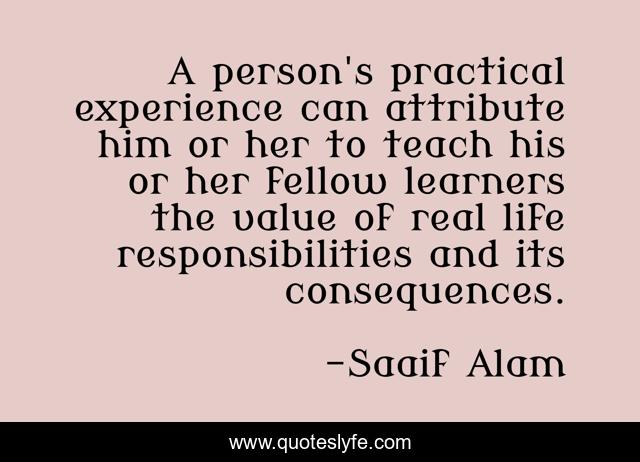 This page presents the quote "A person's practical experience can attribute him or her to teach his or her fellow learners the value of real life responsibilities and its consequences.". Author of this quote is Saaif Alam. This quote is about education, philosophy,.