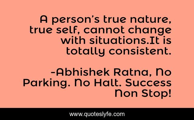 This page presents the quote "A person’s true nature, true self, cannot change with situations.It is totally consistent.". Author of this quote is Abhishek Ratna, No Parking. No Halt. Success Non Stop!. This quote is about situation, self, success, nature,.