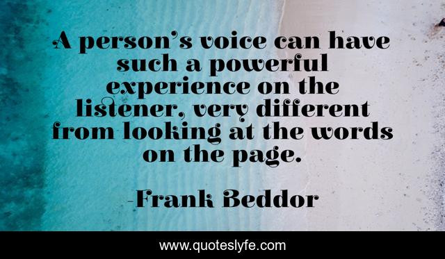 This page presents the quote "A person’s voice can have such a powerful experience on the listener, very different from looking at the words on the page.". Author of this quote is Frank Beddor. This quote is about voice, listening, words-of-wisdom,.