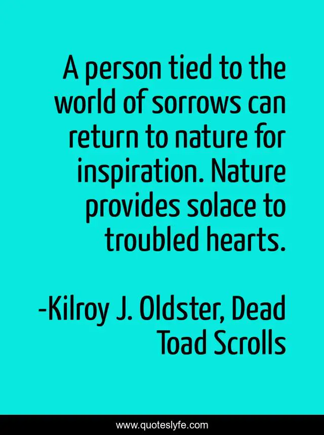 This page presents the quote "A person tied to the world of sorrows can return to nature for inspiration. Nature provides solace to troubled hearts.". Author of this quote is Kilroy J. Oldster, Dead Toad Scrolls. This quote is about solace, nature, sorrow, sad, sadness, inspiration,.