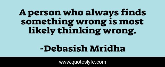 This page presents the quote "A person who always finds something wrong is most likely thinking wrong.". Author of this quote is Debasish Mridha. This quote is about life, love, knowledge, inspirational, intelligence, philosophy, wisdom, wrong, affection,.