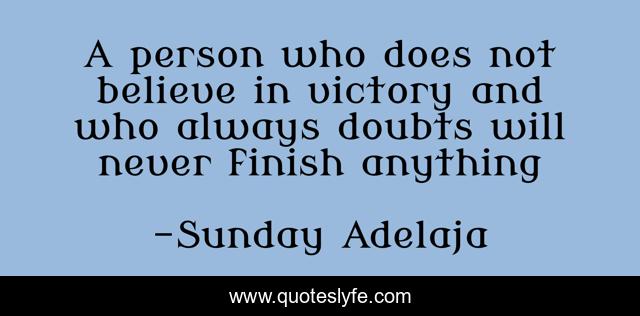 This page presents the quote "A person who does not believe in victory and who always doubts will never finish anything". Author of this quote is Sunday Adelaja. This quote is about person, doubts-finish, believe, victory,.