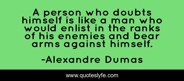 This page presents the quote "A person who doubts himself is like a man who would enlist in the ranks of his enemies and bear arms against himself.". Author of this quote is Alexandre Dumas. This quote is about uncertainties, doubts,.