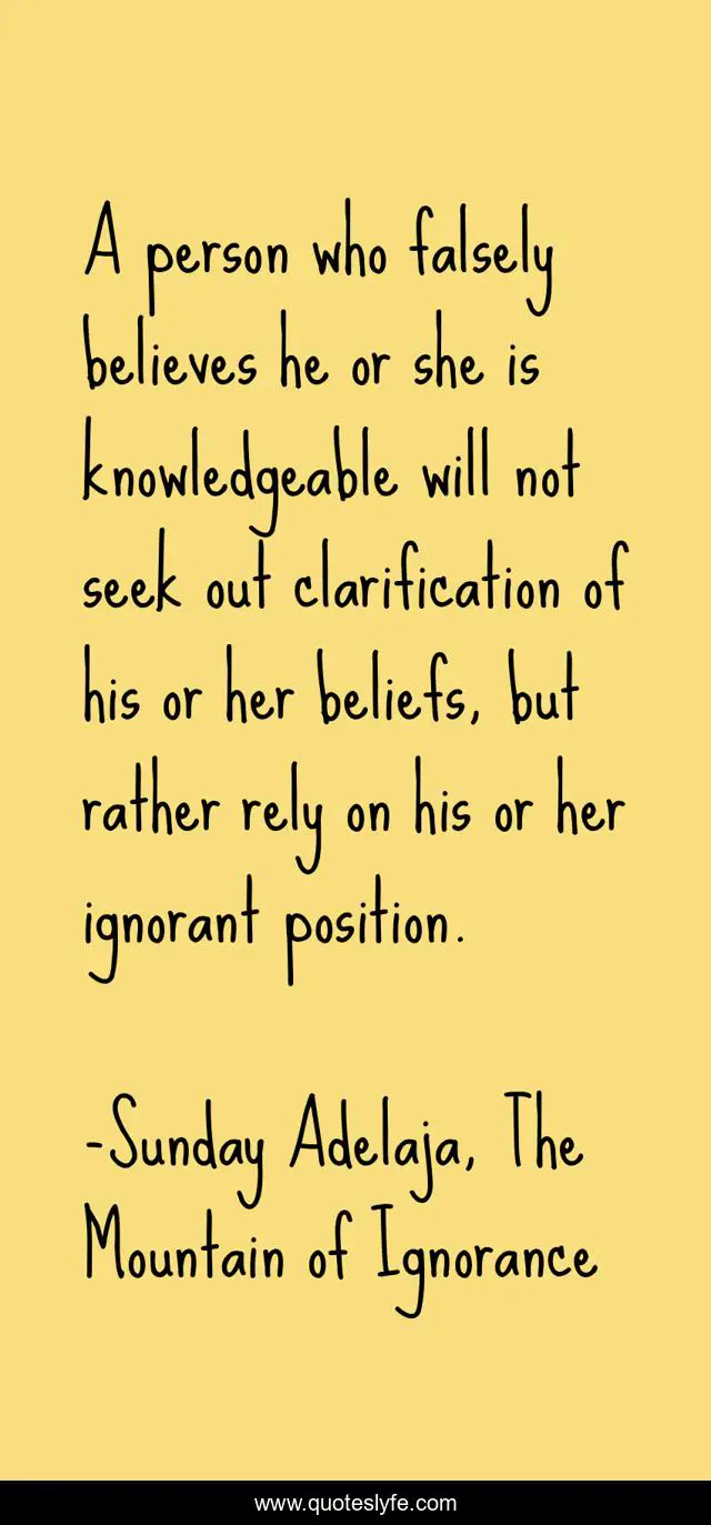 This page presents the quote "A person who falsely believes he or she is knowledgeable will not seek out clarification of his or her beliefs, but rather rely on his or her ignorant position.". Author of this quote is Sunday Adelaja, The Mountain of Ignorance. This quote is about mountain, life, darkness, power, danger, god, people, ignorance, person,.