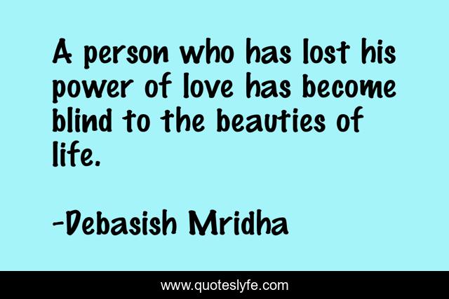 This page presents the quote "A person who has lost his power of love has become blind to the beauties of life.". Author of this quote is Debasish Mridha. This quote is about blind-to-the-beauties-of-life, lost-love, philosophy, debasish-mridha, quotes, debasish-mridha-md, inspirational, enthusiasm, lost-the-power-to-love,.