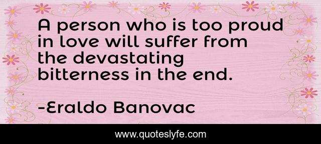 This page presents the quote "A person who is too proud in love will suffer from the devastating bitterness in the end.". Author of this quote is Eraldo Banovac. This quote is about proudness, philosophy, love, love-and-sayings, proud, bitterness, suffering, sociology, love-hurts,.