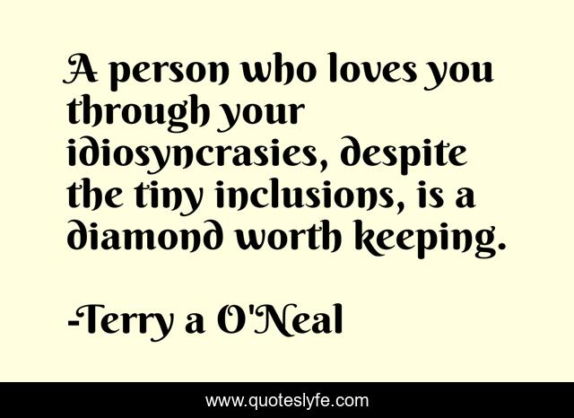 This page presents the quote "A person who loves you through your idiosyncrasies, despite the tiny inclusions, is a diamond worth keeping.". Author of this quote is Terry a O'Neal. This quote is about friendship, love, imperfections, affection,.