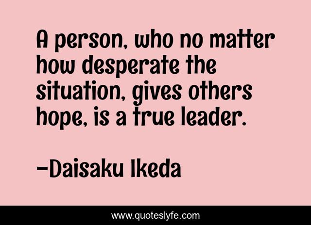 This page presents the quote "A person, who no matter how desperate the situation, gives others hope, is a true leader.". Author of this quote is Daisaku Ikeda. .