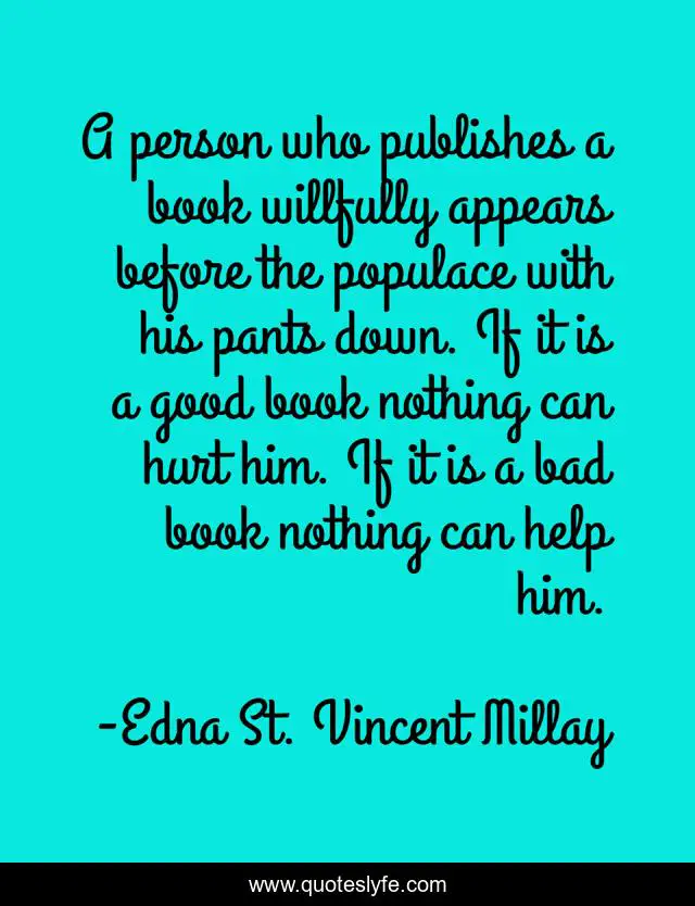 This page presents the quote "A person who publishes a book willfully appears before the populace with his pants down. If it is a good book nothing can hurt him. If it is a bad book nothing can help him.". Author of this quote is Edna St. Vincent Millay. This quote is about writers, publishing, writing,.
