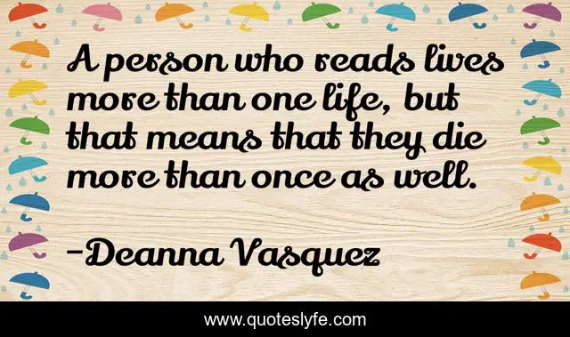This page presents the quote "A person who reads lives more than one life, but that means that they die more than once as well.". Author of this quote is Deanna Vasquez. This quote is about living, life, death, read, books, stories, reading,.