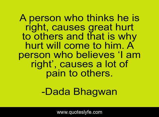 This page presents the quote "A person who thinks he is right, causes great hurt to others and that is why hurt will come to him. A person who believes ‘I am right’, causes a lot of pain to others.". Author of this quote is Dada Bhagwan. This quote is about spiritual, happiness,.