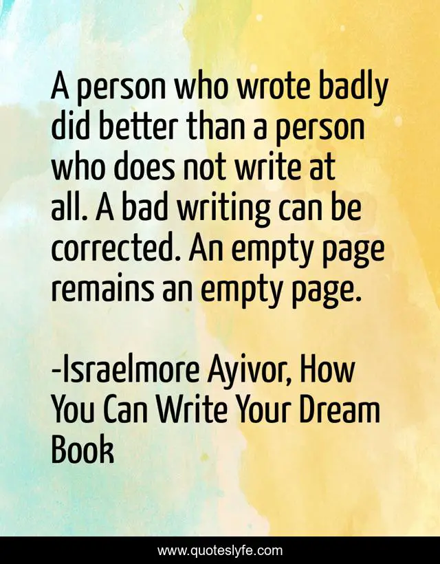 This page presents the quote "A person who wrote badly did better than a person who does not write at all. A bad writing can be corrected. An empty page remains an empty page.". Author of this quote is Israelmore Ayivor, How You Can Write Your Dream Book. This quote is about bad-writing, editing, publishing, writing, writers, editor, authors, israelmore-ayivor, empty-page,.