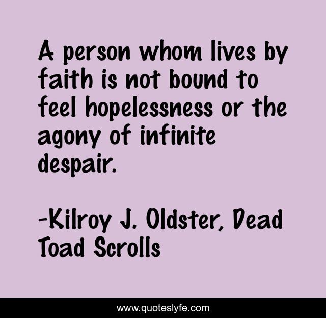 This page presents the quote "A person whom lives by faith is not bound to feel hopelessness or the agony of infinite despair.". Author of this quote is Kilroy J. Oldster, Dead Toad Scrolls. This quote is about faith, despair-and-attitude, faithfulness, desperation, despair, hopelessness, desperate,.