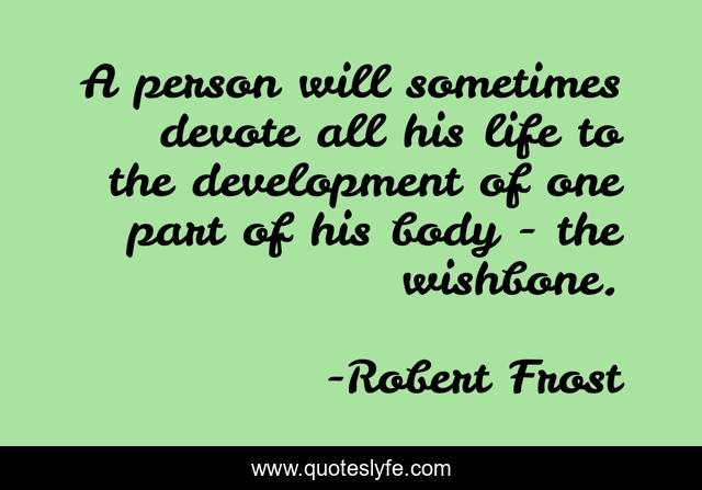 This page presents the quote "A person will sometimes devote all his life to the development of one part of his body - the wishbone.". Author of this quote is Robert Frost. This quote is about body, development, person,.
