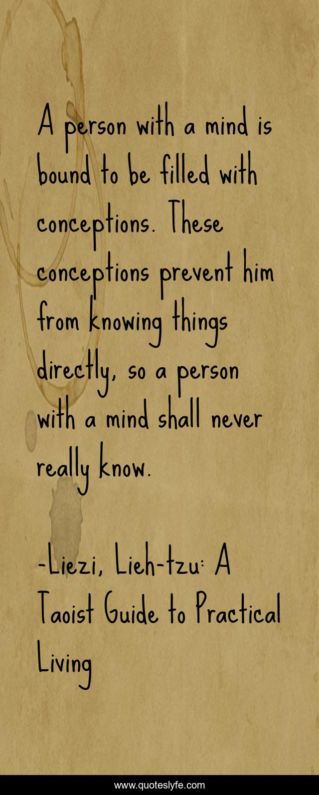 This page presents the quote "A person with a mind is bound to be filled with conceptions. These conceptions prevent him from knowing things directly, so a person with a mind shall never really know.". Author of this quote is Liezi, Lieh-tzu: A Taoist Guide to Practical Living. This quote is about knowledge, direct-experience, mind, conceptions, taoism, projection,.