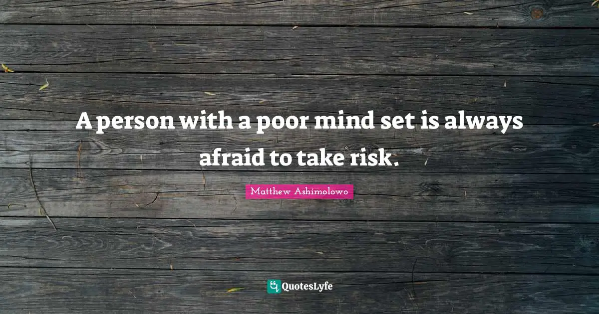 This page presents the quote "A person with a poor mind set is always afraid to take risk.". Author of this quote is Matthew Ashimolowo. This quote is about mind set, risk, mind, poor,.