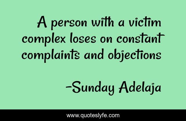 This page presents the quote "A person with a victim complex loses on constant complaints and objections". Author of this quote is Sunday Adelaja. This quote is about life, constant, goal, mission, calling, complex, purpose, victim, complaints,.