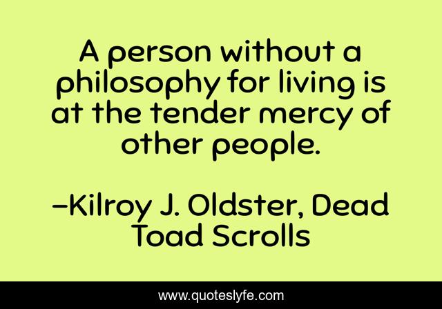 This page presents the quote "A person without a philosophy for living is at the tender mercy of other people.". Author of this quote is Kilroy J. Oldster, Dead Toad Scrolls. This quote is about philosophy-of-life, philosophy, purposeful-living, purpose-driven-life,.