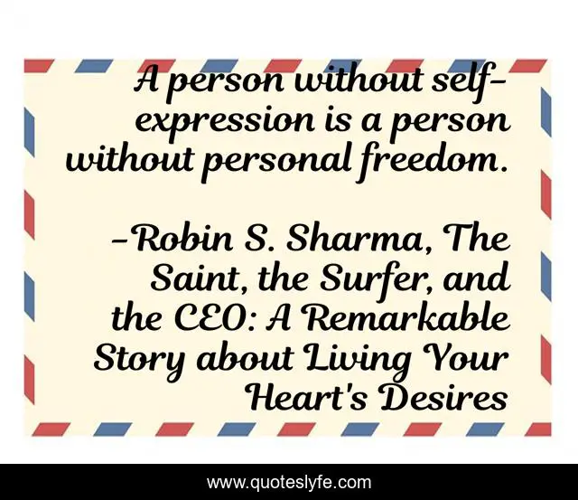 "Robin S. Sharma, The Saint, the Surfer, and the CEO: A Remarkable Story about Living Your Heart's Desires Quotes." Quoteslyfe.com, 2025. Fri. 05 Dec. 2025. <https://www.quoteslyfe.com/quote/A-person-without-self-expression-is-a-236143>.
