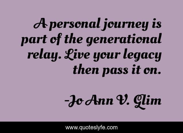 This page presents the quote "A personal journey is part of the generational relay. Live your legacy then pass it on.". Author of this quote is Jo Ann V. Glim. This quote is about family-relationships, legacy, genealogy,.