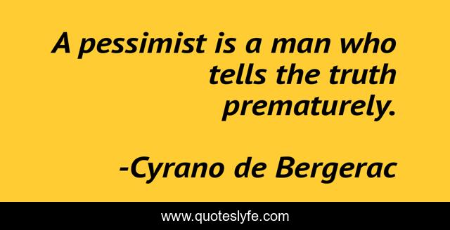 This page presents the quote "A pessimist is a man who tells the truth prematurely.". Author of this quote is Cyrano de Bergerac. This quote is about men, novels, pessimism, truth, bergerac, cyrano-de-bergerac, philosophy,.