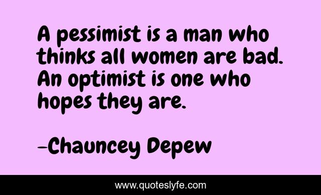 This page presents the quote "A pessimist is a man who thinks all women are bad. An optimist is one who hopes they are.". Author of this quote is Chauncey Depew. This quote is about pessimist, bad, man,.