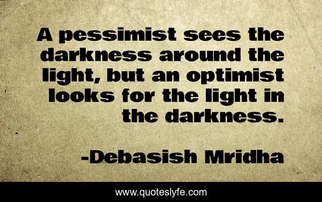 "Debasish Mridha Quotes." Quoteslyfe.com, 2025. Mon. 08 Dec. 2025. <https://www.quoteslyfe.com/quote/A-pessimist-sees-the-darkness-around-the-69449>.