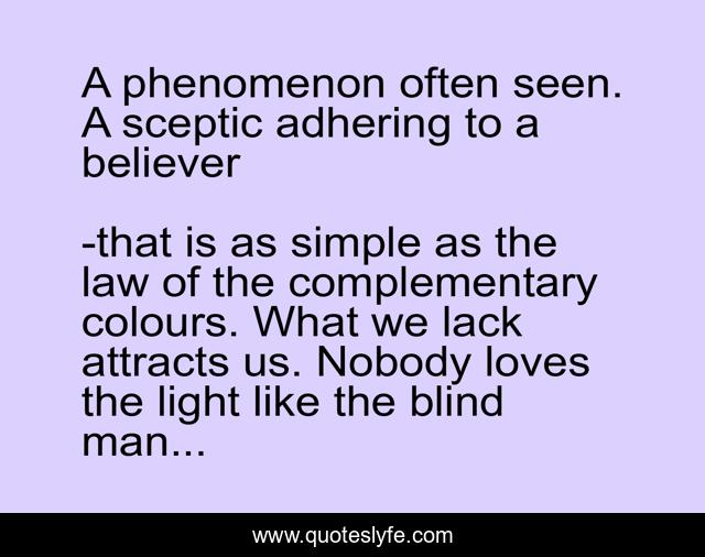 "that is as simple as the law of the complementary colours. What we lack attracts us. Nobody loves the light like the blind man... Quotes." Quoteslyfe.com, 2025. Mon. 08 Dec. 2025. <https://www.quoteslyfe.com/quote/A-phenomenon-often-seen-A-sceptic-adhering-25778>.
