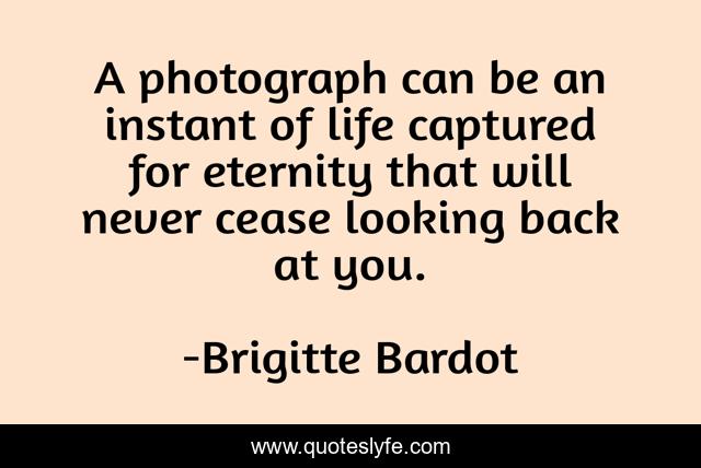 This page presents the quote "A photograph can be an instant of life captured for eternity that will never cease looking back at you.". Author of this quote is Brigitte Bardot. This quote is about photograph, photography,.
