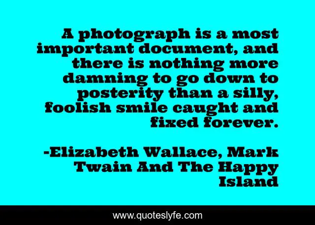 This page presents the quote "A photograph is a most important document, and there is nothing more damning to go down to posterity than a silly, foolish smile caught and fixed forever.". Author of this quote is Elizabeth Wallace, Mark Twain And The Happy Island. This quote is about photograph, mark-twain, photography, silly, smile, foolish, happiness,.