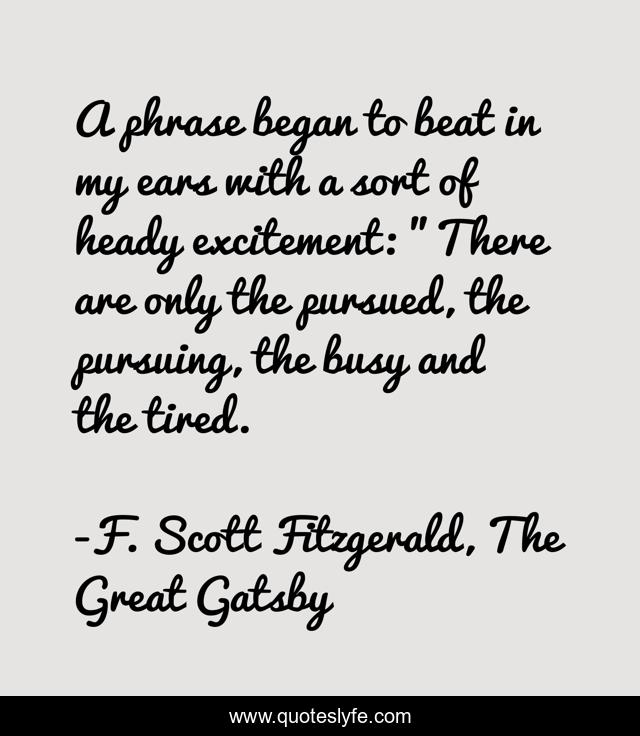 This page presents the quote "A phrase began to beat in my ears with a sort of heady excitement: "There are only the pursued, the pursuing, the busy and the tired.". Author of this quote is F. Scott Fitzgerald, The Great Gatsby. This quote is about living, life, love, romance, inspirational, enthusiasm, affection,.