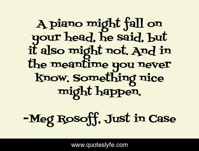 This page presents the quote "A piano might fall on your head, he said, but it also might not. And in the meantime you never know. Something nice might happen.". Author of this quote is Meg Rosoff, Just in Case. This quote is about chance, fate, luck,.