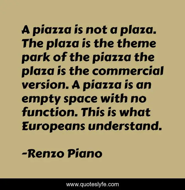 This page presents the quote "A piazza is not a plaza. The plaza is the theme park of the piazza the plaza is the commercial version. A piazza is an empty space with no function. This is what Europeans understand.". Author of this quote is Renzo Piano. This quote is about understand, theme, park,.