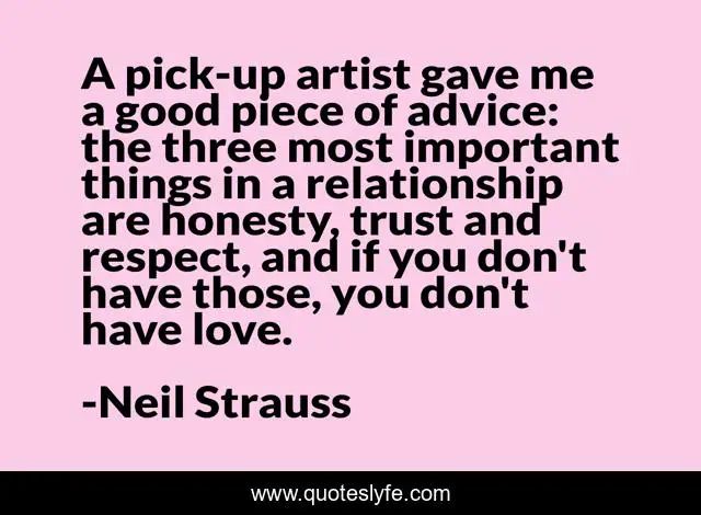 This page presents the quote "A pick-up artist gave me a good piece of advice: the three most important things in a relationship are honesty, trust and respect, and if you don't have those, you don't have love.". Author of this quote is Neil Strauss. This quote is about trust, love, relationship, affection,.