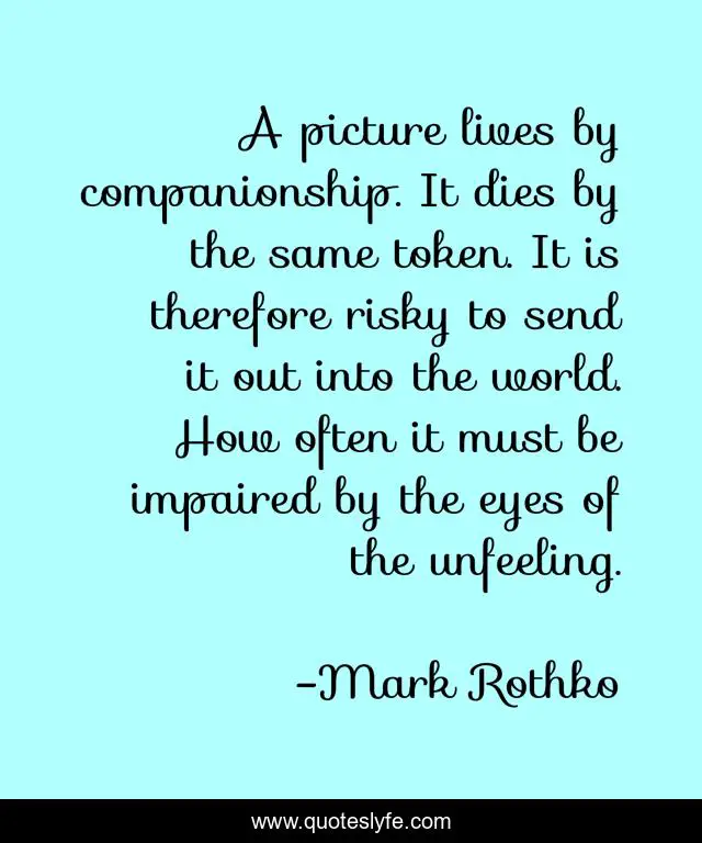 This page presents the quote "A picture lives by companionship. It dies by the same token. It is therefore risky to send it out into the world. How often it must be impaired by the eyes of the unfeeling.". Author of this quote is Mark Rothko. This quote is about art, artist,.