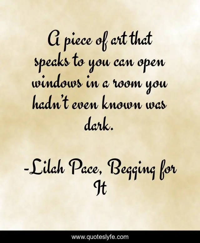 This page presents the quote "A piece of art that speaks to you can open windows in a room you hadn’t even known was dark.". Author of this quote is Lilah Pace, Begging for It. .