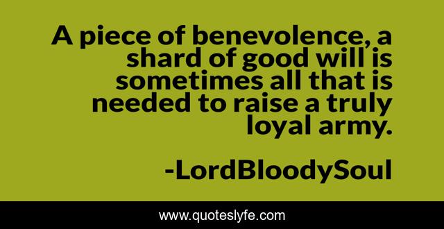 This page presents the quote "A piece of benevolence, a shard of good will is sometimes all that is needed to raise a truly loyal army.". Author of this quote is LordBloodySoul. This quote is about good, loyalty, benevolence, goodness, lordbloodysoul, kindness, war,.
