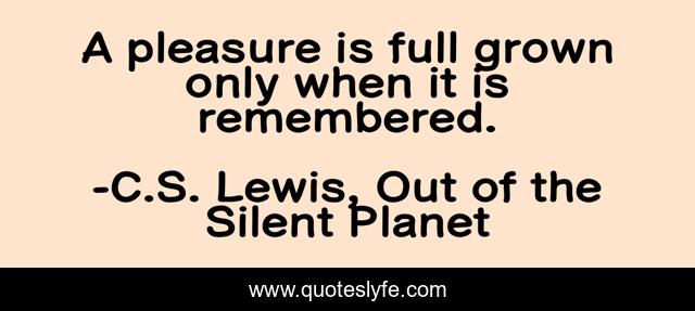 This page presents the quote "A pleasure is full grown only when it is remembered.". Author of this quote is C.S. Lewis, Out of the Silent Planet. This quote is about pleasure, memory,.