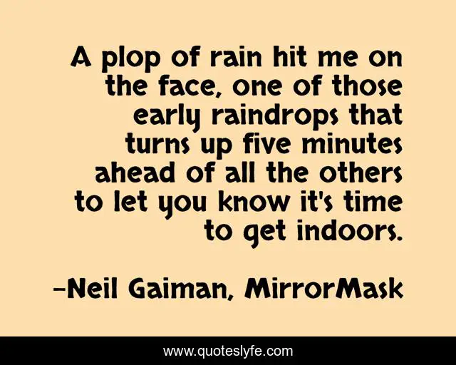 This page presents the quote "A plop of rain hit me on the face, one of those early raindrops that turns up five minutes ahead of all the others to let you know it's time to get indoors.". Author of this quote is Neil Gaiman, MirrorMask. This quote is about raindrops, rain,.