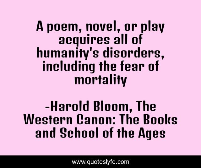 This page presents the quote "A poem, novel, or play acquires all of humanity's disorders, including the fear of mortality". Author of this quote is Harold Bloom, The Western Canon: The Books and School of the Ages. This quote is about culture, assumptions, depravity, heritage,.