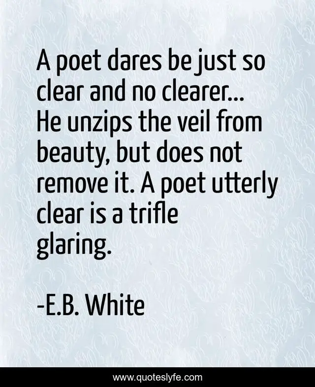 This page presents the quote "A poet dares be just so clear and no clearer... He unzips the veil from beauty, but does not remove it. A poet utterly clear is a trifle glaring.". Author of this quote is E.B. White. This quote is about poet, poetry, beauty,.