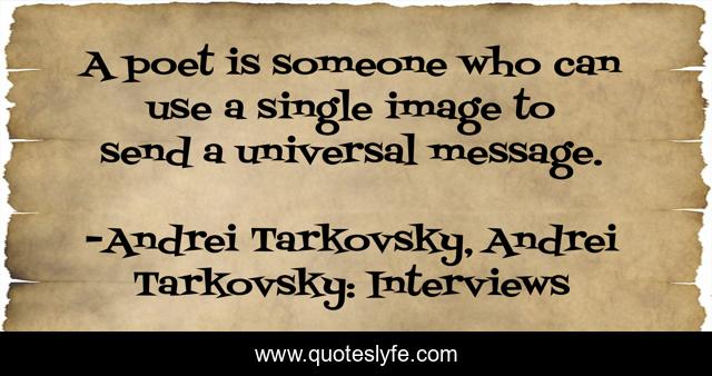 This page presents the quote "A poet is someone who can use a single image to send a universal message.". Author of this quote is Andrei Tarkovsky, Andrei Tarkovsky: Interviews. This quote is about poetry, film, narrative,.