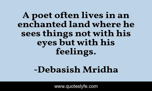 This page presents the quote "A poet often lives in an enchanted land where he sees things not with his eyes but with his feelings.". Author of this quote is Debasish Mridha. This quote is about what-makes-a-poet, philosophy, debasish-mridha, poetry, quotes, see-things-with-feelings, debasish-mridha-md, inspirational, poet,.