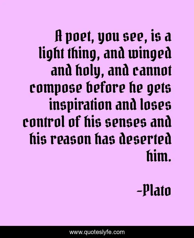 This page presents the quote "A poet, you see, is a light thing, and winged and holy, and cannot compose before he gets inspiration and loses control of his senses and his reason has deserted him.". Author of this quote is Plato. This quote is about senses, holy, plato, reason, poet, composition, inspiration,.