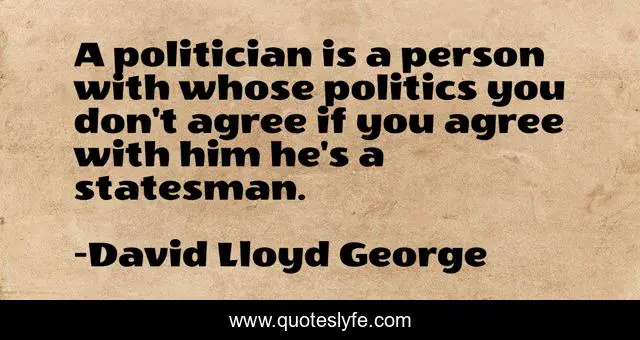 This page presents the quote "A politician is a person with whose politics you don't agree if you agree with him he's a statesman.". Author of this quote is David Lloyd George. This quote is about person, him,.