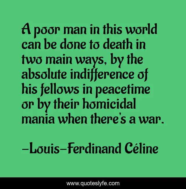 This page presents the quote "A poor man in this world can be done to death in two main ways, by the absolute indifference of his fellows in peacetime or by their homicidal mania when there's a war.". Author of this quote is Louis-Ferdinand Céline. This quote is about celine, poverty, war, poor-man,.