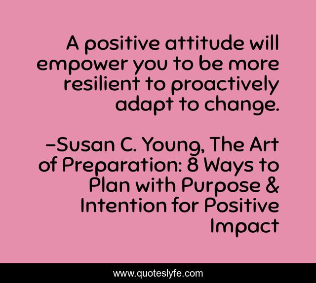 This page presents the quote "A positive attitude will empower you to be more resilient to proactively adapt to change.". Author of this quote is Susan C. Young, The Art of Preparation: 8 Ways to Plan with Purpose & Intention for Positive Impact. This quote is about build-confidence, susan-young, relationship, communication-skills, attitude, behaviour, quotes-by-susan-c-young, preparation, mindset,.