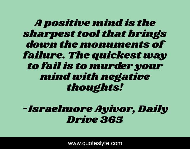 This page presents the quote "A positive mind is the sharpest tool that brings down the monuments of failure. The quickest way to fail is to murder your mind with negative thoughts!". Author of this quote is Israelmore Ayivor, Daily Drive 365. This quote is about opinions, impacts, idea, negative, legacy, negative-thoughts, fail, tools, food-for-thought,.