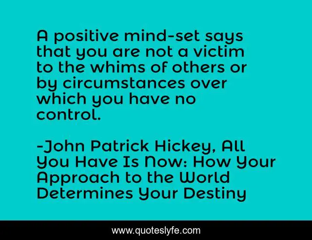 This page presents the quote "A positive mind-set says that you are not a victim to the whims of others or by circumstances over which you have no control.". Author of this quote is John Patrick Hickey, All You Have Is Now: How Your Approach to the World Determines Your Destiny. This quote is about success, personal-growth, action, achievement, personal-development, goal-setting, goals,.