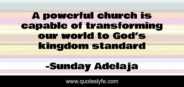 This page presents the quote "A powerful church is capable of transforming our world to God’s kingdom standard". Author of this quote is Sunday Adelaja. This quote is about kingdom, capable, transforming, god, powerful, standard, church, world,.